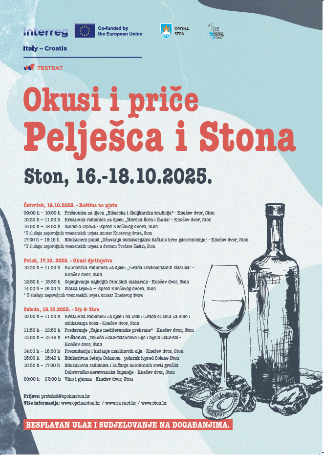 Općina Ston i Razvojna agencija Stona RAST pozivaju sve ljubitelje domaćih okusa, vina i mediteranske tradicije na eno-gastronomsko događanje „Okusi i priče Pelješca i Stona“, koje će se održati od 16. do 18. listopada 2025. godine u Stonu.(PROGRAM U PRIVITKU)
